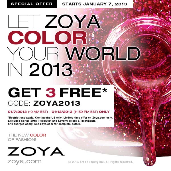* Promotion Excludes Zoya Nail Treatments, Gilty Pleasures and Spring 2013 Lovely & PixieDust Collection colors Continental US only. Not valid in conjunction with other coupons, codes or promotions.